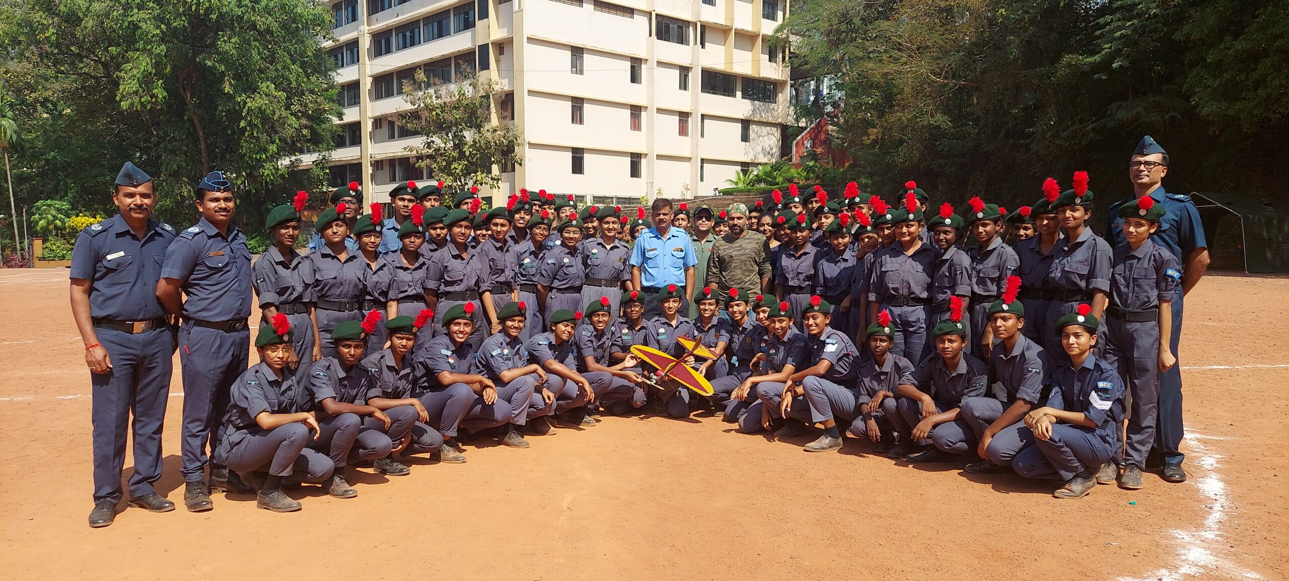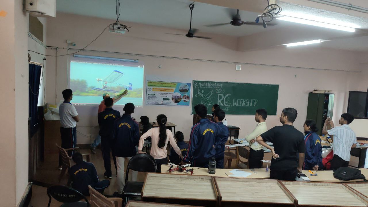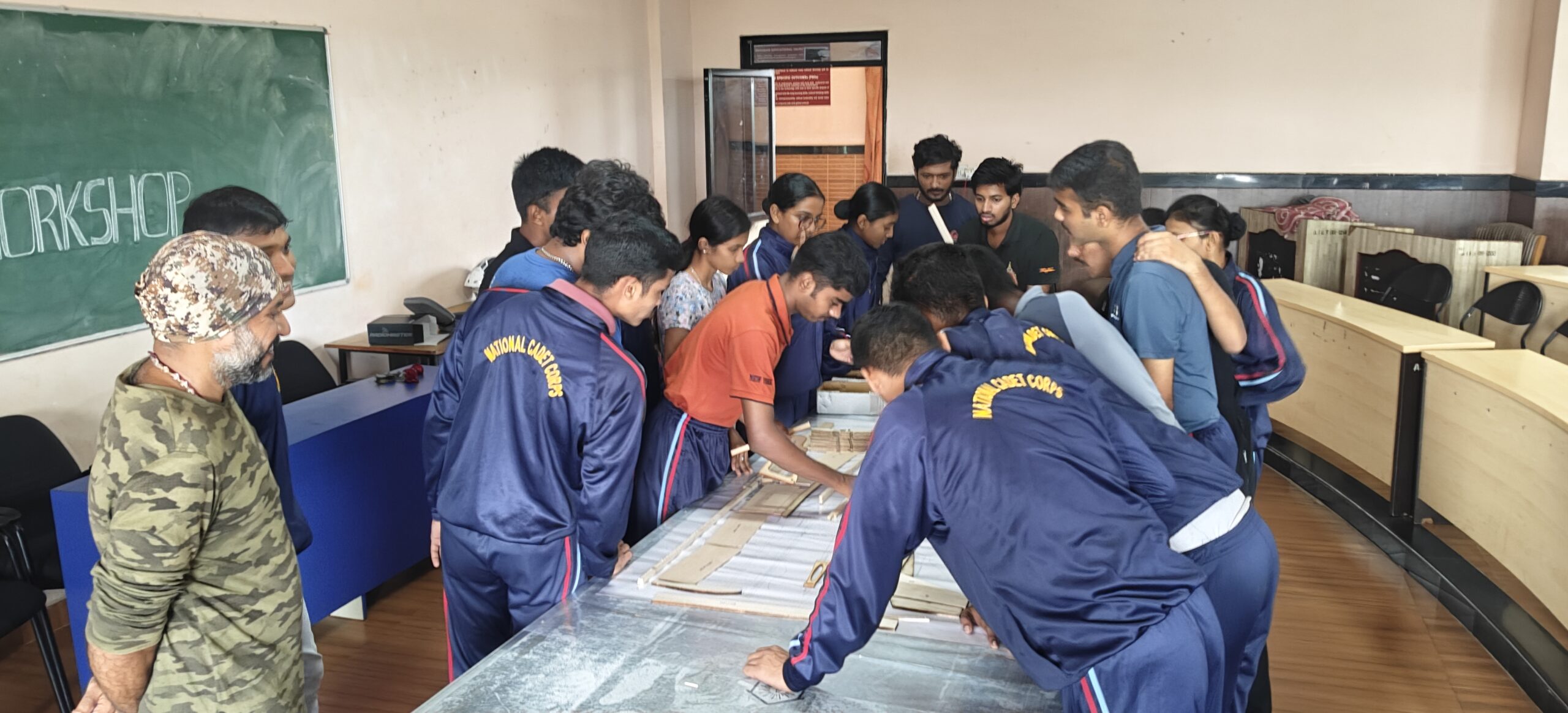 "NCC cadets learning to build a static model of an Embraer aircraft during an aeromodelling workshop."