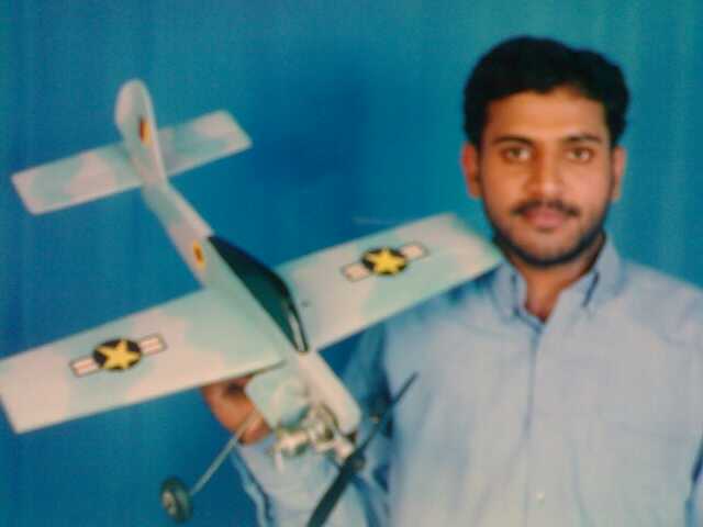 Pushhpraj Shrinivas Ameenn holding a colorful control line aerobatic planes.