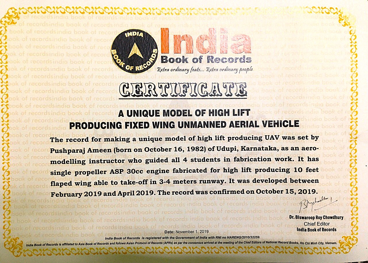 High-Lift Unmanned Aerial Vehicle (UAV) recognized in the India Book of Records.